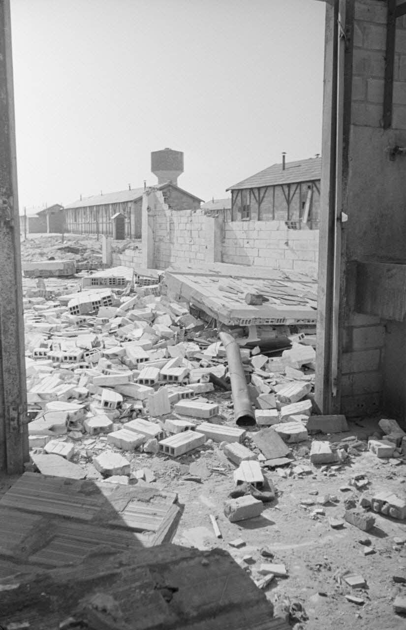 En Gironde, un Frontstalag dans le secteur de Bordeaux (peut-être le Frontstalag 221) et des rues de Bordeaux endommagées.