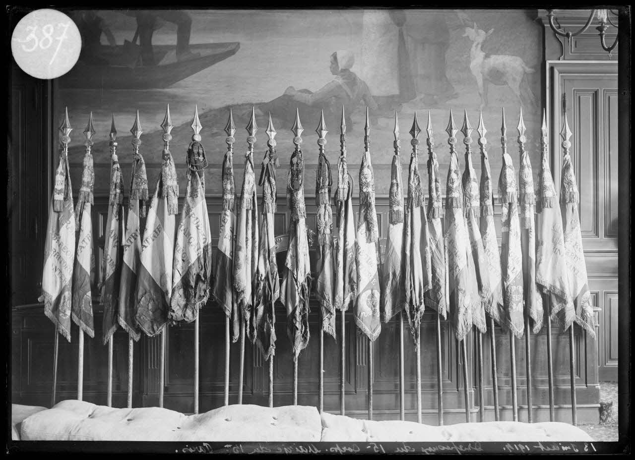 13 juillet [1919] Drapeaux du 15e corps d'armée, Mairie du 15e à Paris. [légende d'origine]