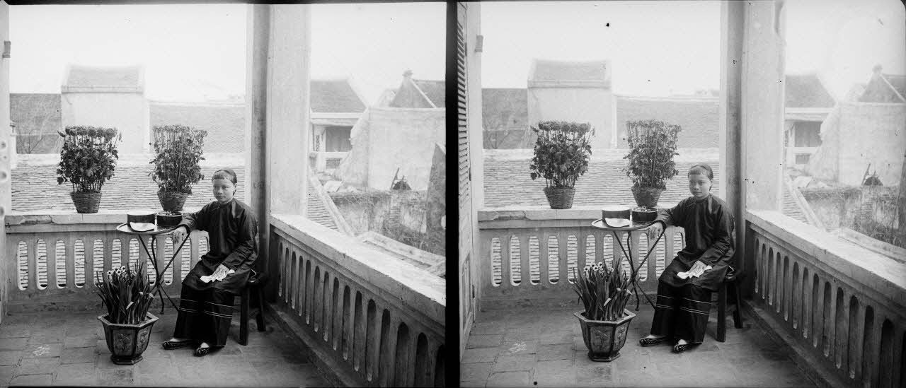 Portrait d'une jeune femme chinoise sur une terasse dans un logement de la ville d'Hanoï.
