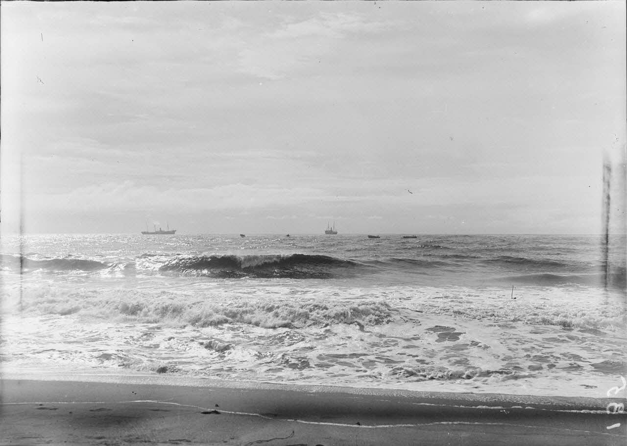 135. "La ville de Pernambucco" mouillée en vue de Mananjary, les chalands transbordent les bagages et passagers. (Ce navire annexe de la C[ompagn]ie des messageries, dessert la côte Est de F[or]t Dauphin à Tamatave [)]. [légende d'origine]