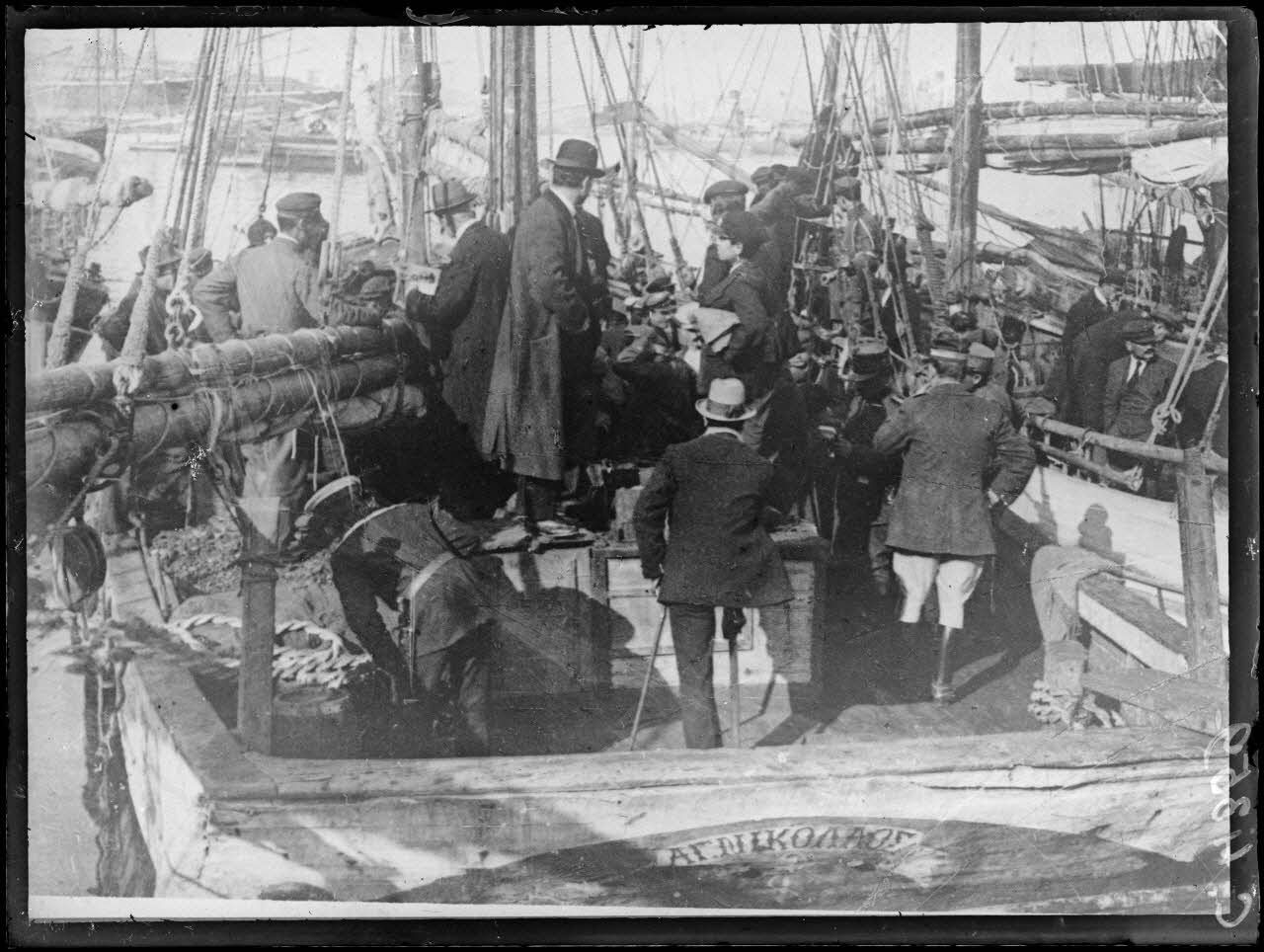 Le Pirée. À bord d'un voilier. Distribution du charbon. [légende d'origine]