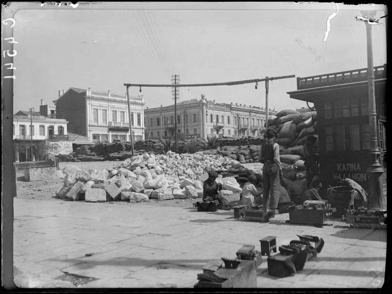 Le Pirée. Sacs de farine restant en plein air faute de place. [légende d'origine]