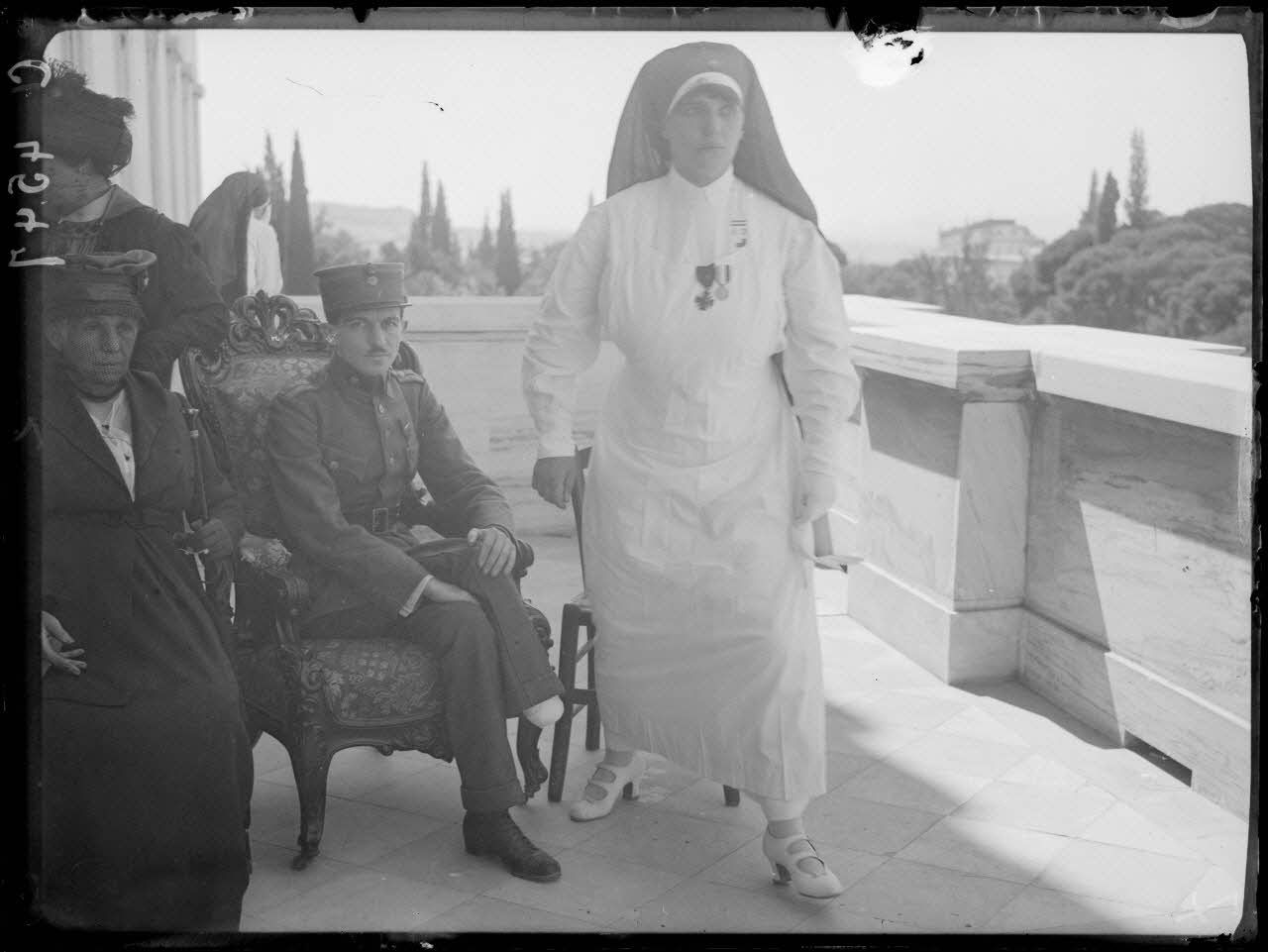 Athènes. Inauguration de l'hôpital Royal. Un glorieux blessé (28 ans, 9 blessures) et son infirmière. [légende d'origine]