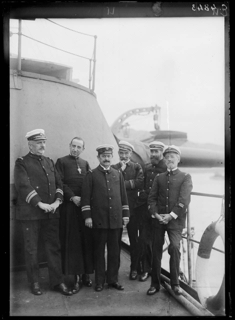 Port du Pirée. Groupe d'officiers et l'aumônier à bord de la "Vérité". [légende d'origine]