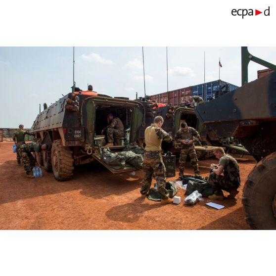 Des tirailleurs du 1er RT du GTIA (groupement tactique interarmes) Turco préparent leur équipement à charger à l'intérieur de VBCI (véhicule blindé de combat d'infanterie) en stationnement sur le train de combat du camp M'Poko de Bangui.