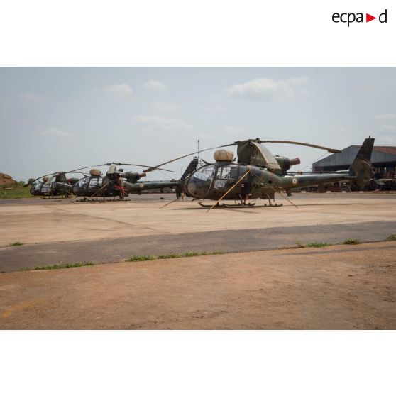 Hélicoptères SA-342 Gazelle du 3e RHC intégré au SGAM (sous-groupement aéromobile) Barracuda de l'Alat, en stationnement sur la piste de l'aéroport de M'Poko de Bangui.
