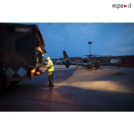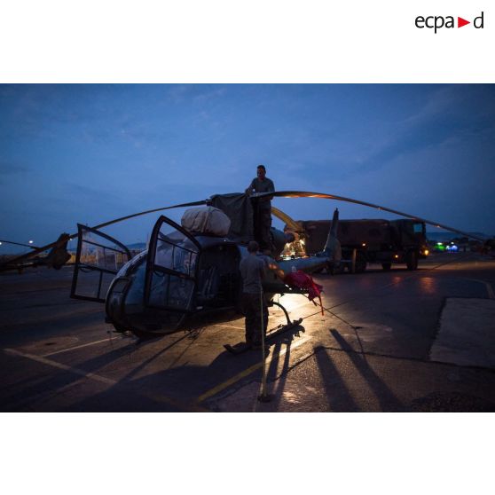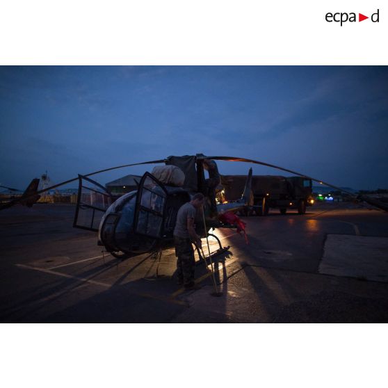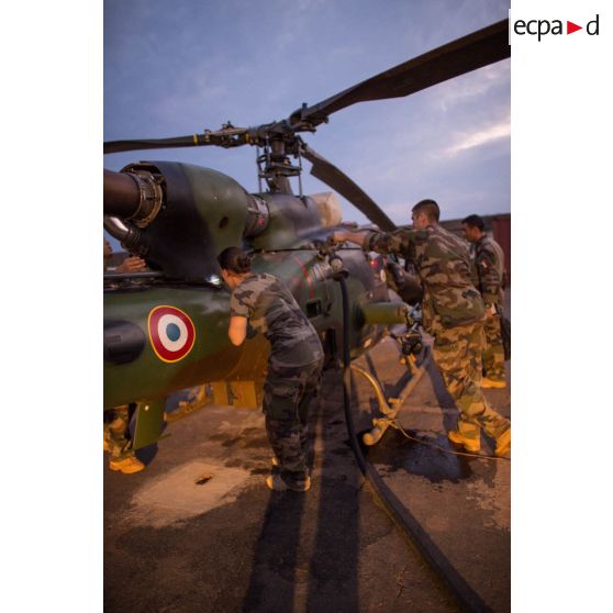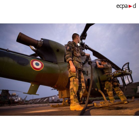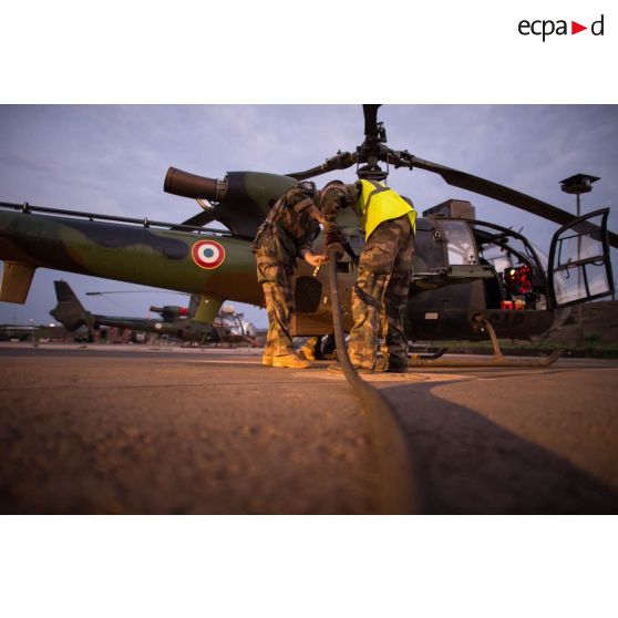 Avitaillement en carburant et maintien en condition opérationnelle d'un hélicoptère SA-342 Gazelle du 3e RHC intégré au SGAM (sous-groupement aéromobile) Barracuda de l'Alat, en stationnement sur la piste de l'aéroport de M'Poko de Bangui.