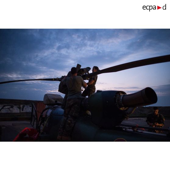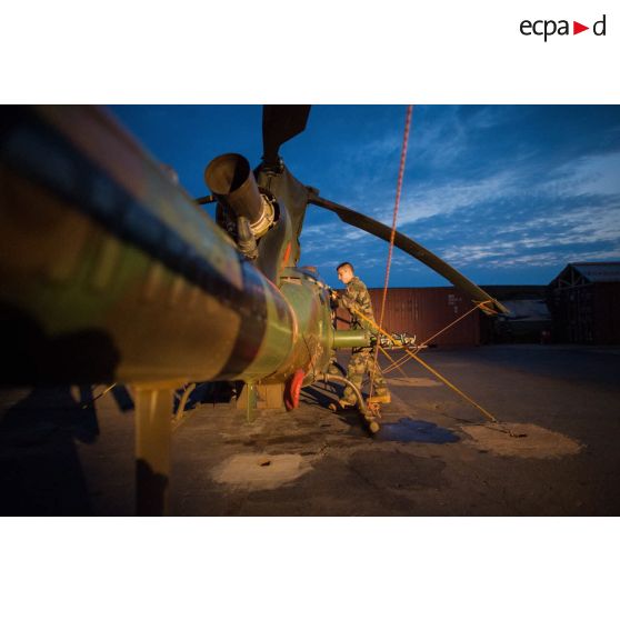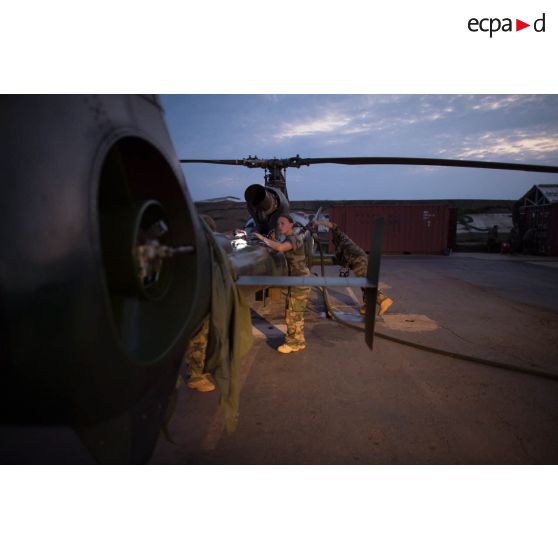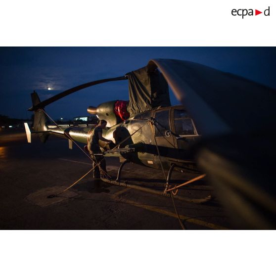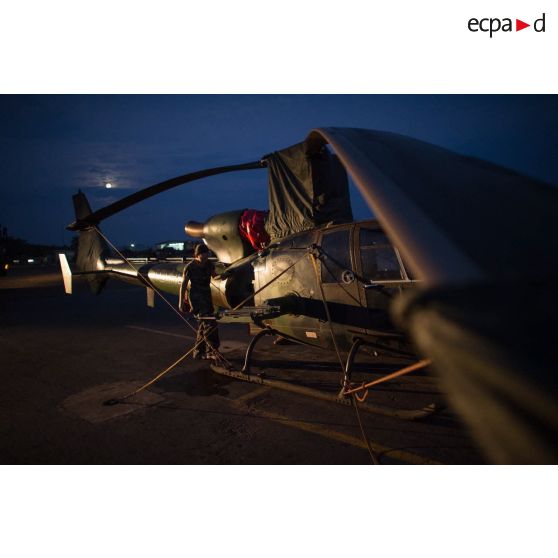 Maintien en condition opérationnelle d'un hélicoptère SA-342 Gazelle du 3e RHC intégré au SGAM (sous-groupement aéromobile) Barracuda de l'Alat, en stationnement sur la piste de l'aéroport de M'Poko de Bangui.