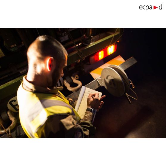 Un élément du SEA (Service des essences des armées) remplit un rapport dans le cadre de l'avitaillement d'un hélicoptère SA-342 Gazelle du 3e RHC intégré au SGAM (sous-groupement aéromobile) Barracuda de l'Alat, en stationnement sur la piste de l'aéroport de M'Poko de Bangui.