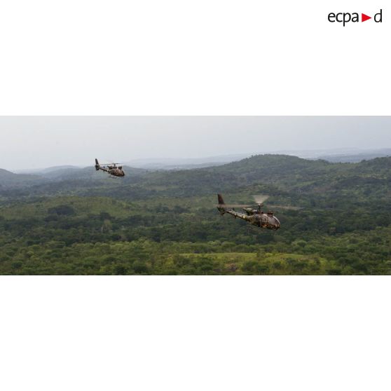 Deux hélicoptères Gazelle SA-342 M du SGAM (sous-groupement aéromobile) Barracuda armé par le 3e RHC, survolent la forêt centrafricaine pour une mission de vol de reconnaissance d'axe sur la MSR2 (main supply road n°2 ou route de ravitaillement principale n°2).