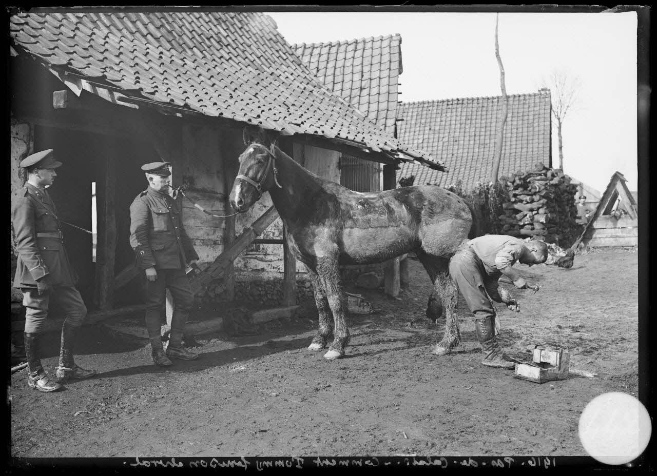 1916, Pas-de-Calais, Comment Tommy ferre son cheval. [légende d'origine]