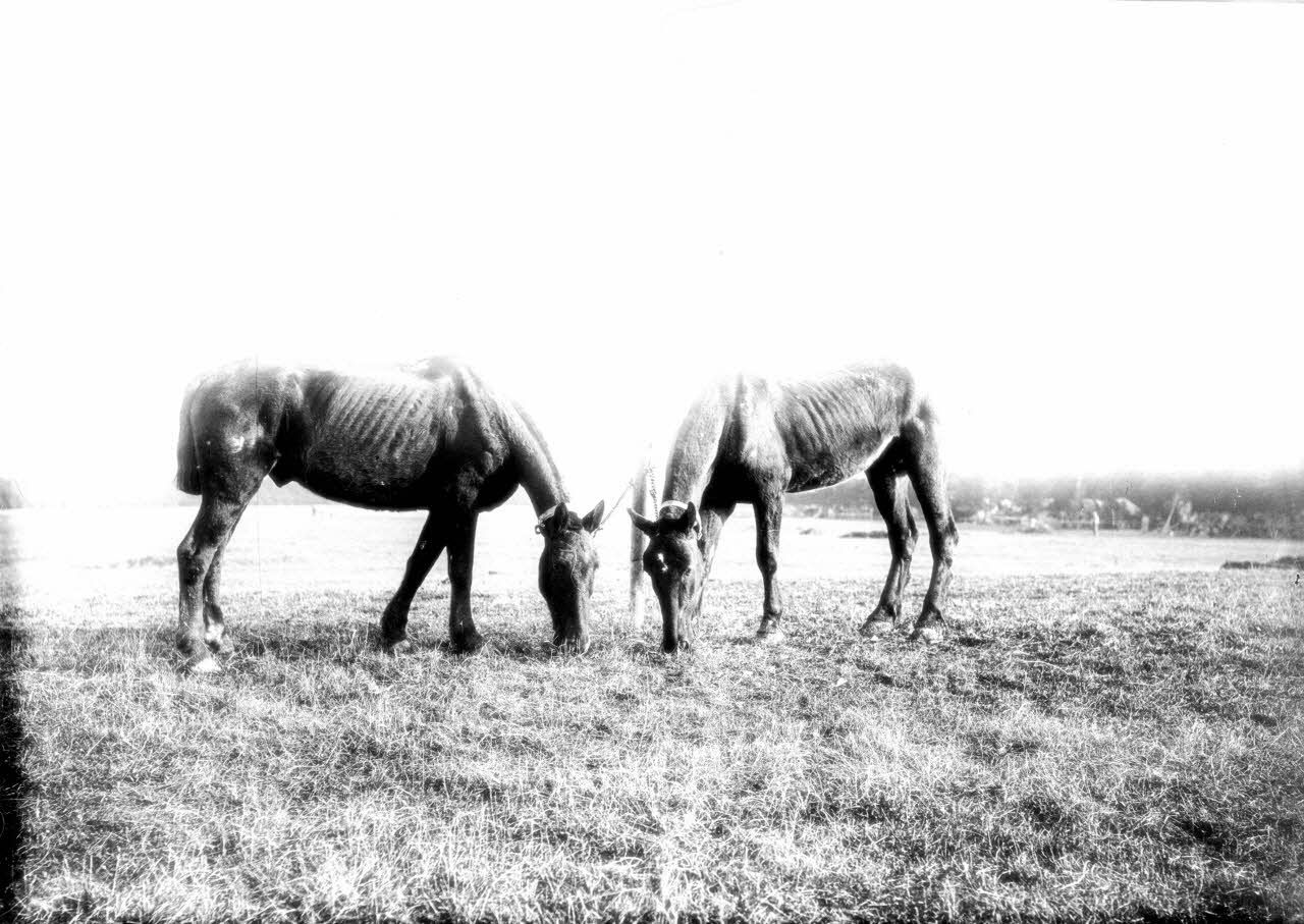 1918, Champagne, chevaux d'artillerie usés jusqu'à la corde. [légende d'origine]