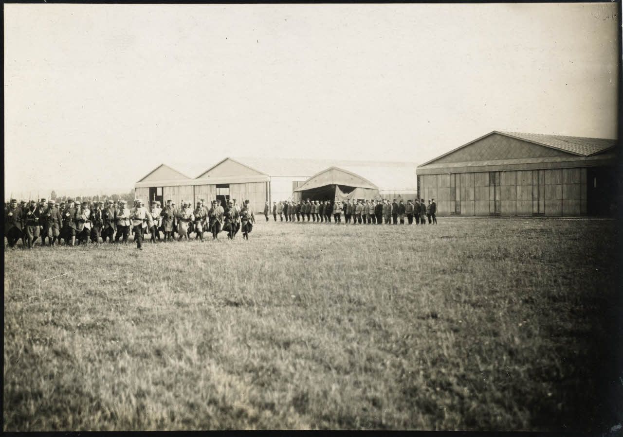 Pilotes et observateurs du camp, gagnant l'emplacement fixé pour la cérémonie de remise de décoration au sergent pilote Drouet.