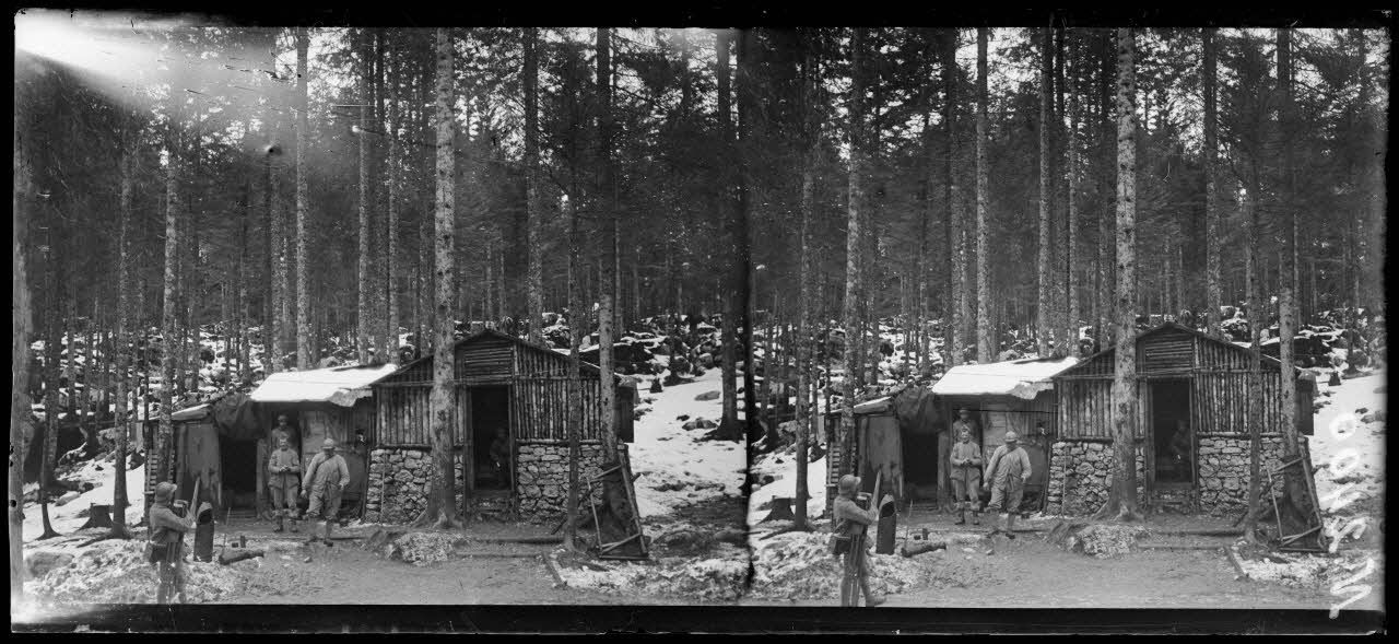 Monte Sprunck, région d'Asiago. Cantonnement de troupes françaises sous bois.