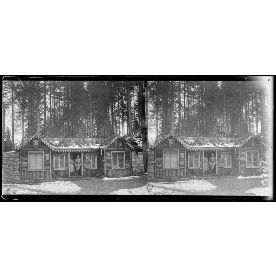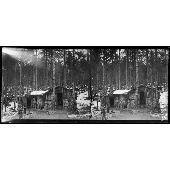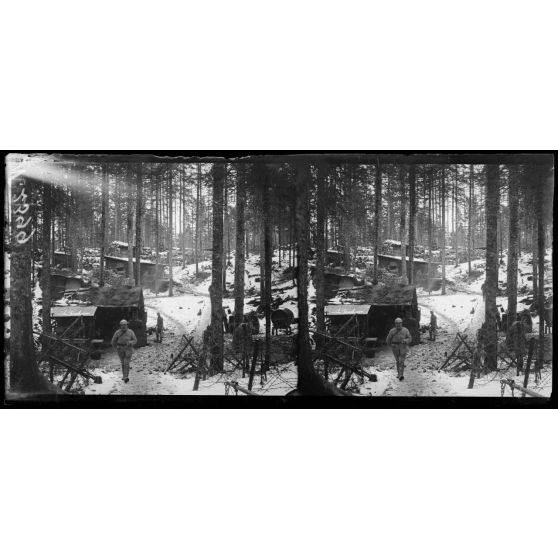 Monte Sprunck, région d'Asiago. Cantonnement de troupes françaises sous bois.