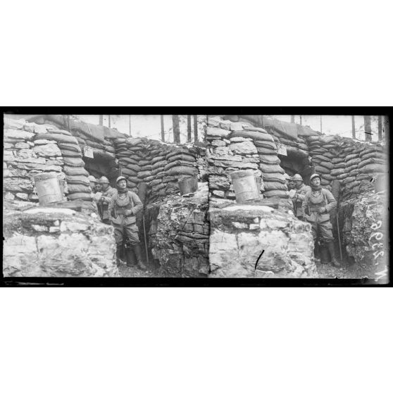 Monte Sprunck, région d'Asiago. Soldats français à l'entrée d'un abri (28-4-18).