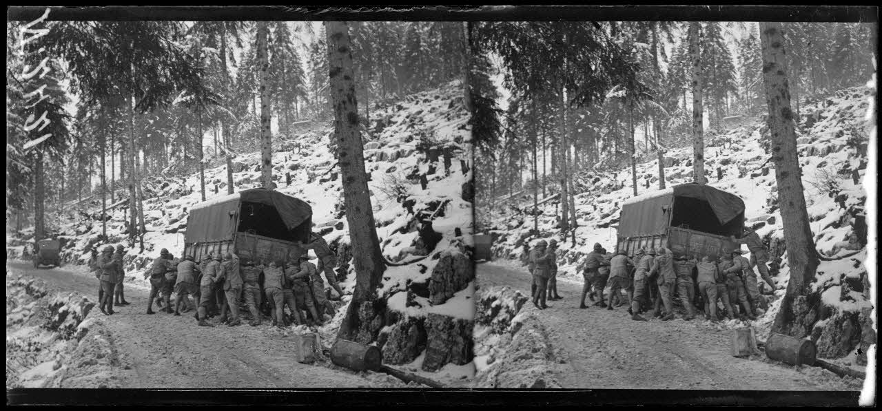 Officiers et soldats sont photographiés devant des postes de commandement, des abris, des tranchées couvertes, des postes d'observation et de guet, un poste de secours. Les troupes italiennes et françaises sont au cantonnement dans les sous-bois ; des clichés montrent une cuisine, le coiffeur, un dépôt d'eau. Le ravitaillement en vivres et en eau se fait à dos de mulet. Des pièces d'artillerie, notamment une batterie de 75 mm, montent en ligne. Les routes sont enneigées et des soldats doivent en effectuer le déblaiement.