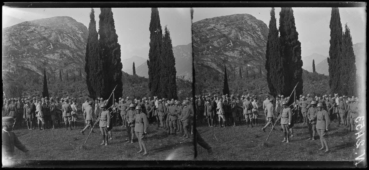 A Rivoli Veronese, le reportage montre une vue panoramique prise depuis le terrain du centre d'instruction de l'armée et une vue de l’Adige près d’une cluse située au nord-ouest de la ville. Les vues montrent ensuite la cérémonie d'exhumation des corps des grenadiers tombés en 1797, devant le monument édifié à l'époque, en présence du général Grange. Les officiers français et italiens sont photographiés devant la fosse et le monument. Ils rendent les honneurs avant une bénédiction.