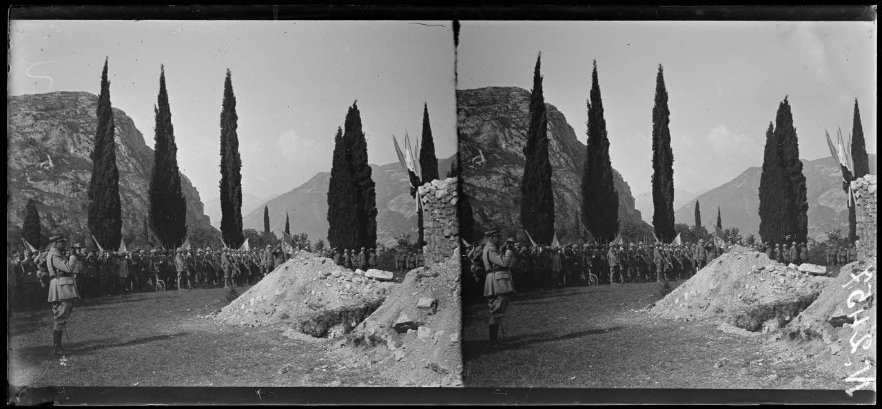 A Rivoli Veronese, le reportage montre une vue panoramique prise depuis le terrain du centre d'instruction de l'armée et une vue de l’Adige près d’une cluse située au nord-ouest de la ville. Les vues montrent ensuite la cérémonie d'exhumation des corps des grenadiers tombés en 1797, devant le monument édifié à l'époque, en présence du général Grange. Les officiers français et italiens sont photographiés devant la fosse et le monument. Ils rendent les honneurs avant une bénédiction.