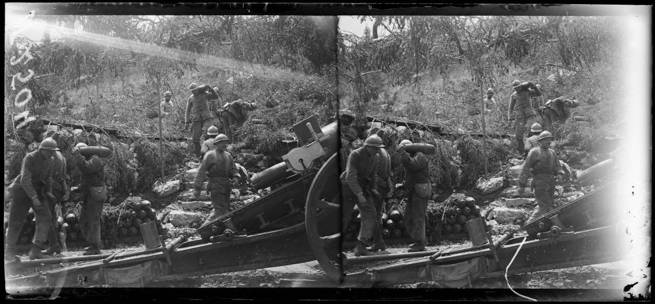 Au Campo Rossignolo, un canon de 155 Schneider court est en batterie sur le flanc de la montagne. Les servants chargent la pièce et tirent. Un cantonnement est visible ainsi que des abris dans les rochers. Des mulets sont conduits à un abreuvoir ; des soldats déjeunent. Deux soldats italiens cassent des cailloux au marteau pour empierrer les routes. On enterre un soldat français. L'état-major du 1er groupe du 112e régiment d'artillerie lourde est présent.