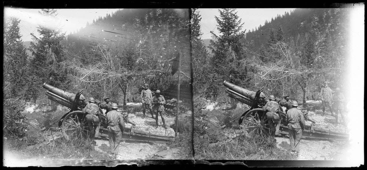 Au Campo Rossignolo, un canon de 155 Schneider court est en batterie sur le flanc de la montagne. Les servants chargent la pièce et tirent. Un cantonnement est visible ainsi que des abris dans les rochers. Des mulets sont conduits à un abreuvoir ; des soldats déjeunent. Deux soldats italiens cassent des cailloux au marteau pour empierrer les routes. On enterre un soldat français. L'état-major du 1er groupe du 112e régiment d'artillerie lourde est présent.