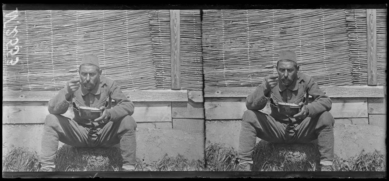 Vicence. Camp de prisonniers. Un prisonnier à l'heure de la soupe. [légende d'origine]