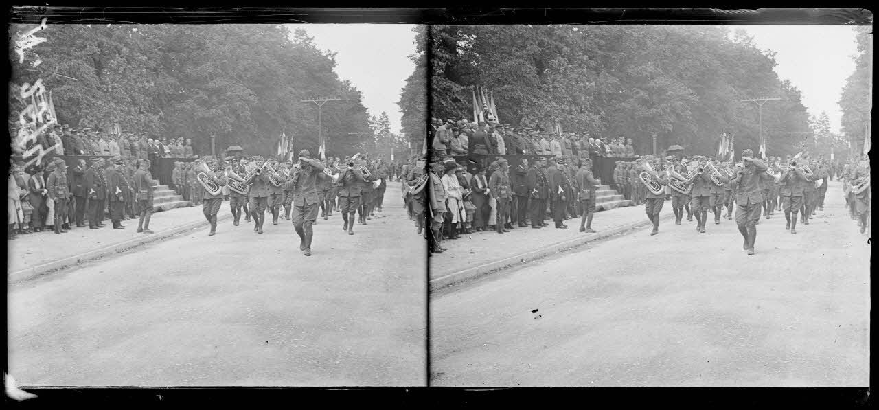 Chaumont (Haute-Marne). Le 14 juillet au Q.G.américain. Le défilé des troupes, une musique d'infanterie (14-7-18). [légende d'origine]