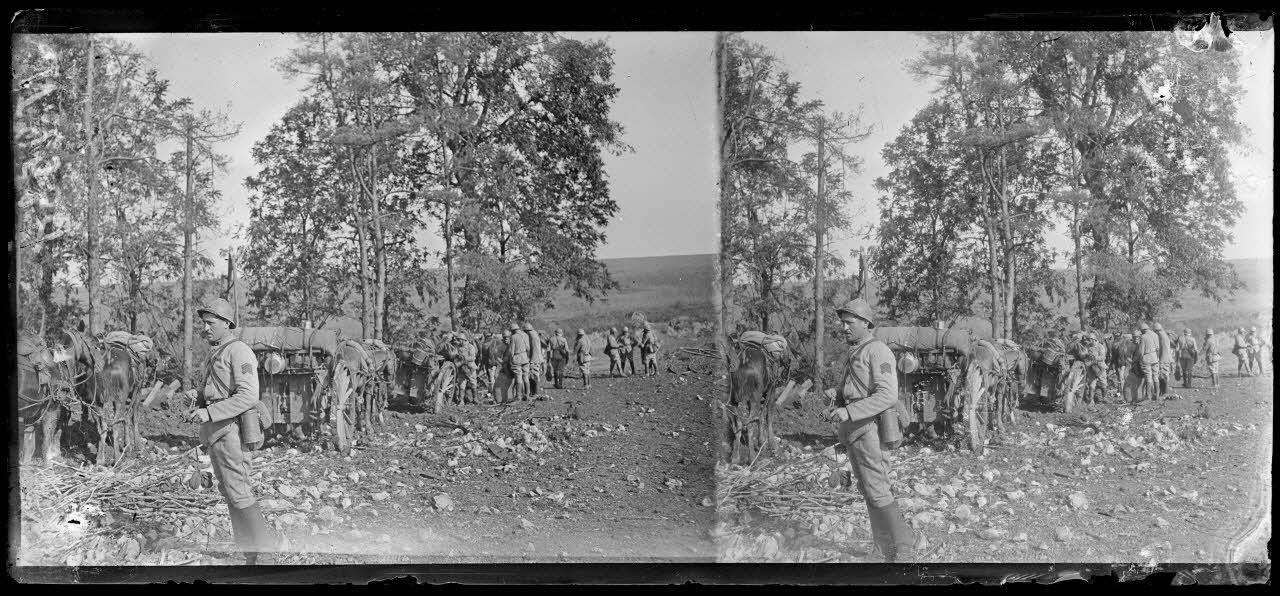 Vers Longpont (ferme de Beaurepaire). Terrain conquis par la 38e DI, régiment d'infanterie coloniale du Maroc. Echelons d'artillerie. [légende d'origine]