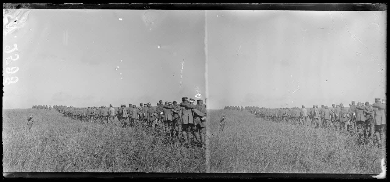 Vers Longpont (ferme de Beaurepaire). Terrain conquis par la 38e DI, régiment d'infanterie coloniale du Maroc. Prisonniers sous la garde d'Américains.