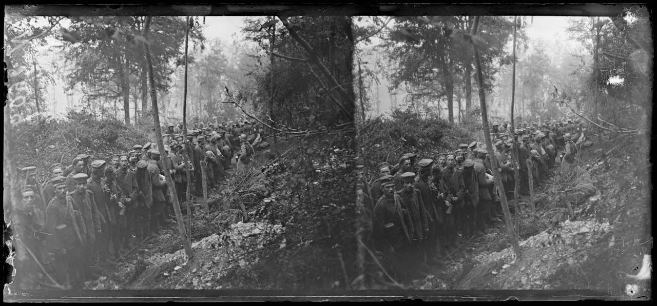 Vers Longpont (ferme de Beaurepaire). Terrain conquis par la 38e DI, régiment d'infanterie coloniale du Maroc. Prisonniers sous la garde d'Américains.
