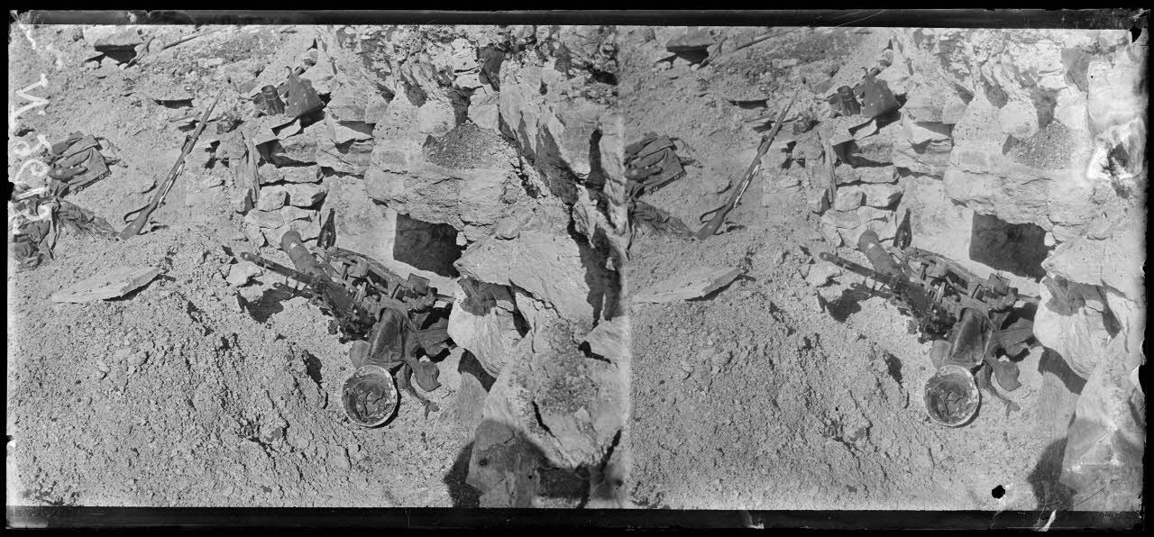 Vers Longpont (ferme de Beaurepaire). Terrain conquis par la 38e DI, régiment d'infanterie coloniale du Maroc. Mitrailleuse allemande retournée contre l'ennemi.