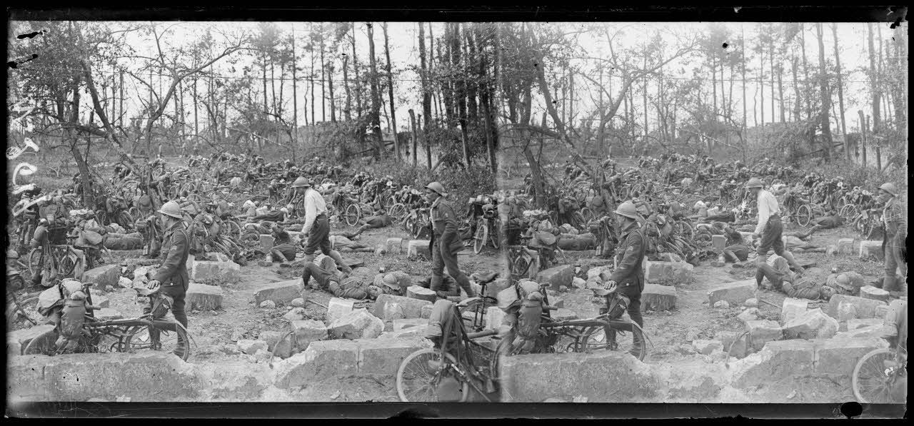 Attaque du 18 juillet 1918. Forêt de Villers-Cotterêts (Aisne). Chasseurs cyclistes faisant halte.