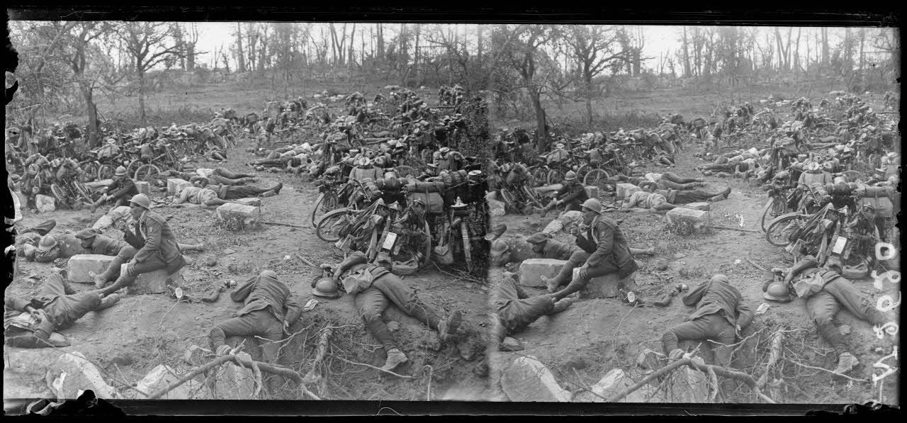 Attaque du 18 juillet 1918. Forêt de Villers-Cotterêts (Aisne). Chasseurs cyclistes faisant halte.