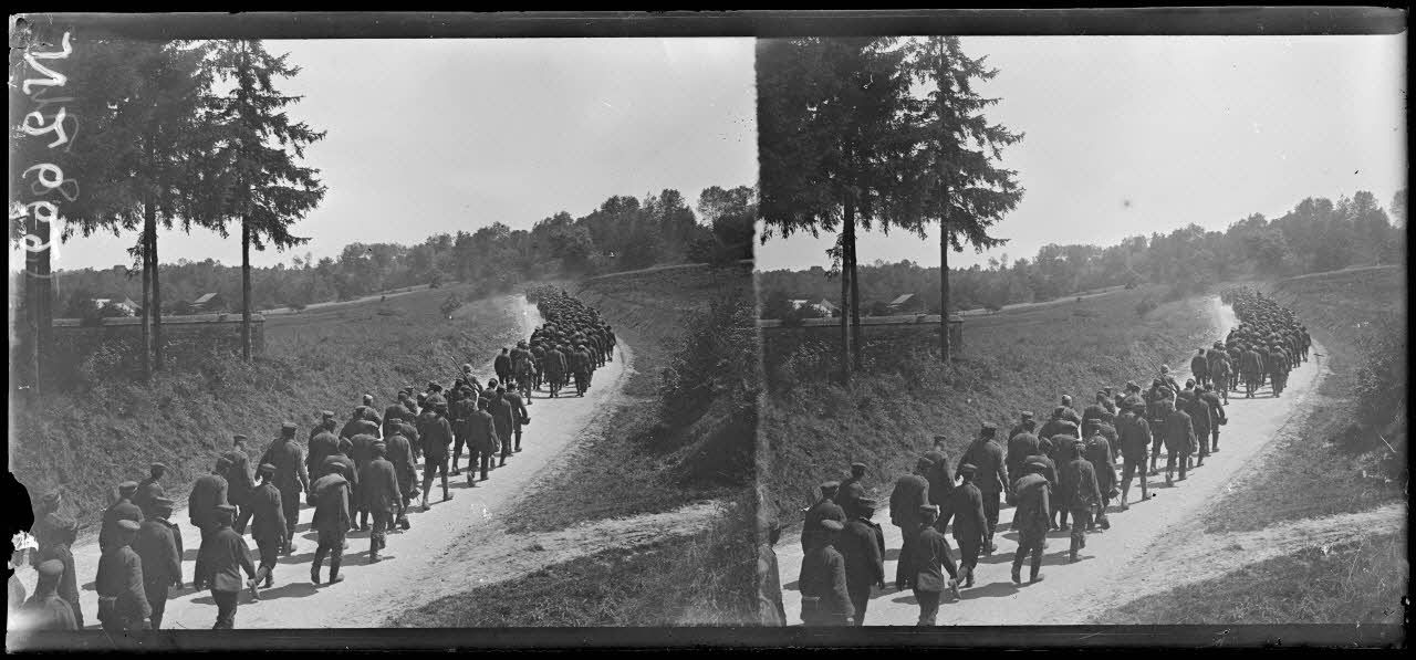A Béthancourt, dans l'Oise, des prisonniers alsaciens et lorrains qui se sont rendus sont regroupés dans un camp. Une colonne de prisonniers allemands arrive des lignes, précédée de ses officiers.