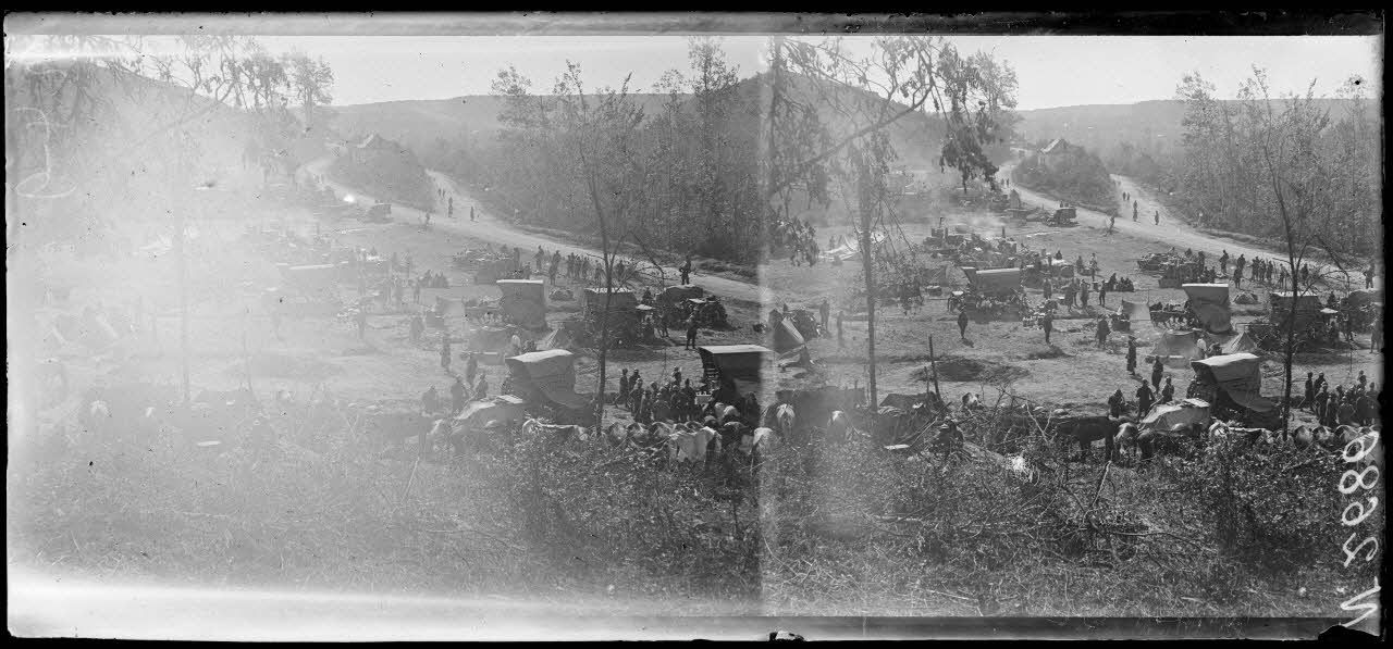Mouvements de troupes à l'arrière des lignes, dans les villages repris à l'ennemi lors de l'offensive du 18 juillet 1918, dans l'Aisne. Visite de Georges Clemenceau au général Mangin, dans l'Oise.