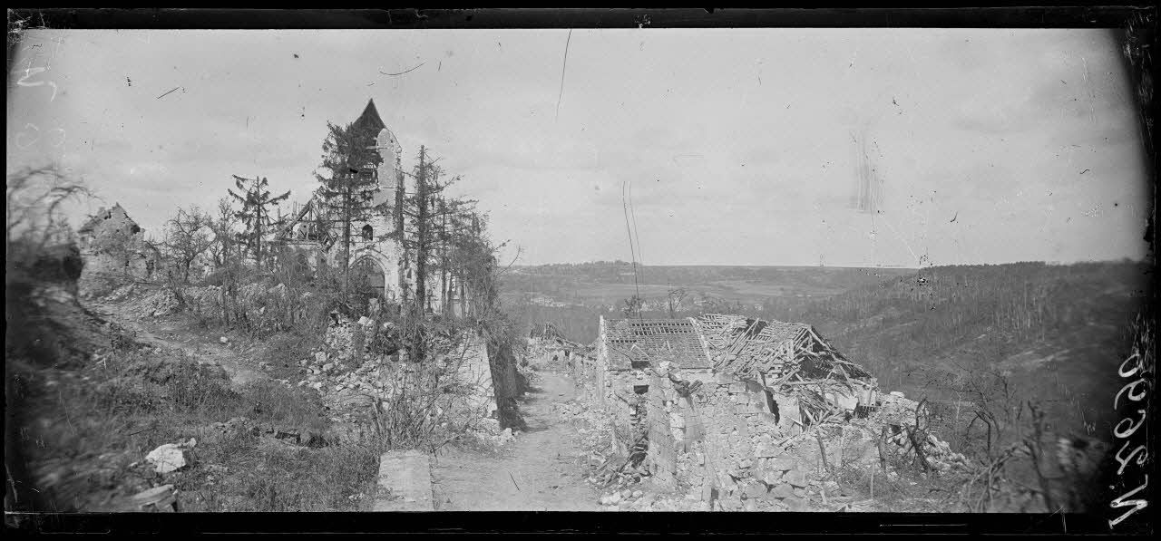A Saint-Pierre-Aigle, dans l’Aisne, des soldats réparent une route. A Valsery, vue d'un camp de tirailleurs sénégalais. A Cutry, le village et l’église sont en ruines.