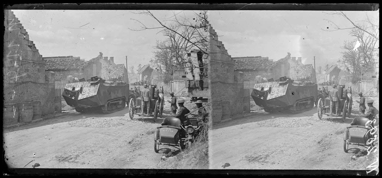 Dommiers (Aisne). Char d'assaut Saint-Chamond traversant le village.