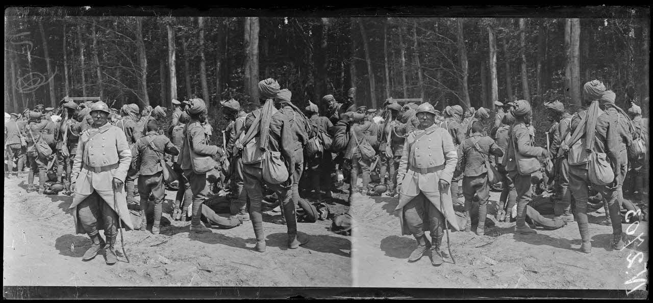 Route de Villers-Cotterêts à Soissons (Aisne). Troupes hindoues venant relever des troupes franco-américaines et tirailleurs sénégalais allant au repos. [légende d'origine]