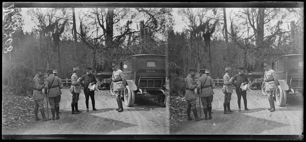 Villers-Cotterêts (Aisne). Visite du Président de la République. Le Président conduit par le général Mangin examine le matériel pris aux allemands (2-8-18).