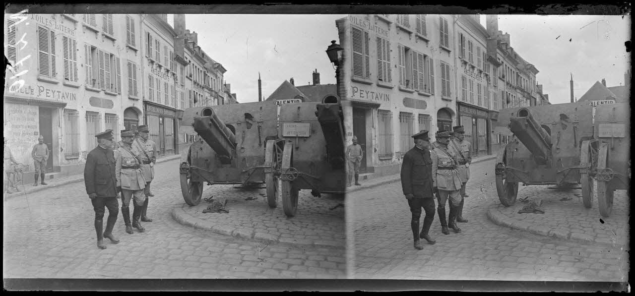 Visite du président de la République au général Mangin à Villers-Cotterêts, le 2 août 1918 et pièces d'artillerie prises aux Allemands exposées dans les villages alentours.