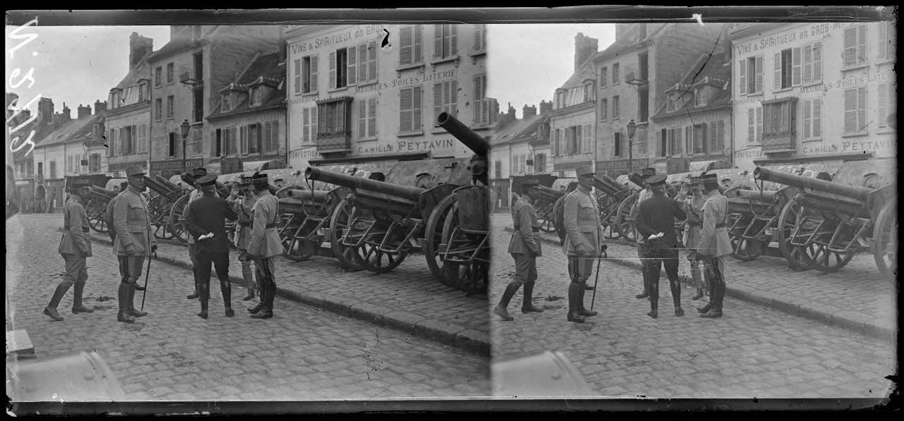 Visite du président de la République au général Mangin à Villers-Cotterêts, le 2 août 1918 et pièces d'artillerie prises aux Allemands exposées dans les villages alentours.