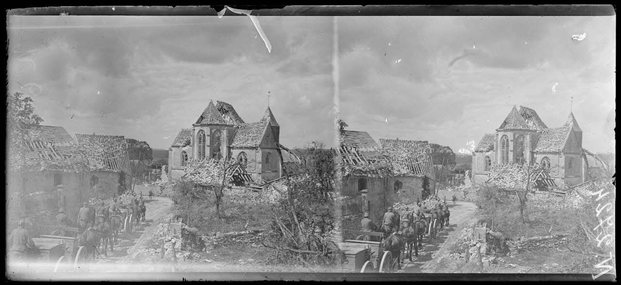 Louâtre (Aisne). Convoi taversant le village, à droite, l'église. [légende d'origine]