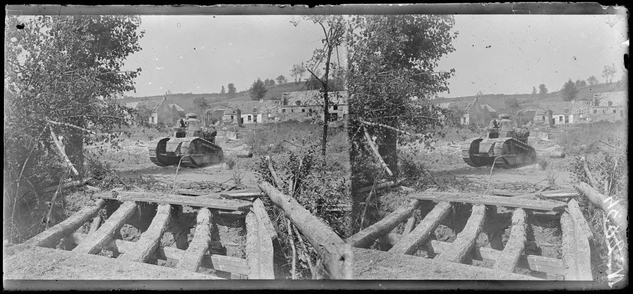 Audignicourt (Aisne). Chars d'assaut Renault traversant le village. [légende d'origine]