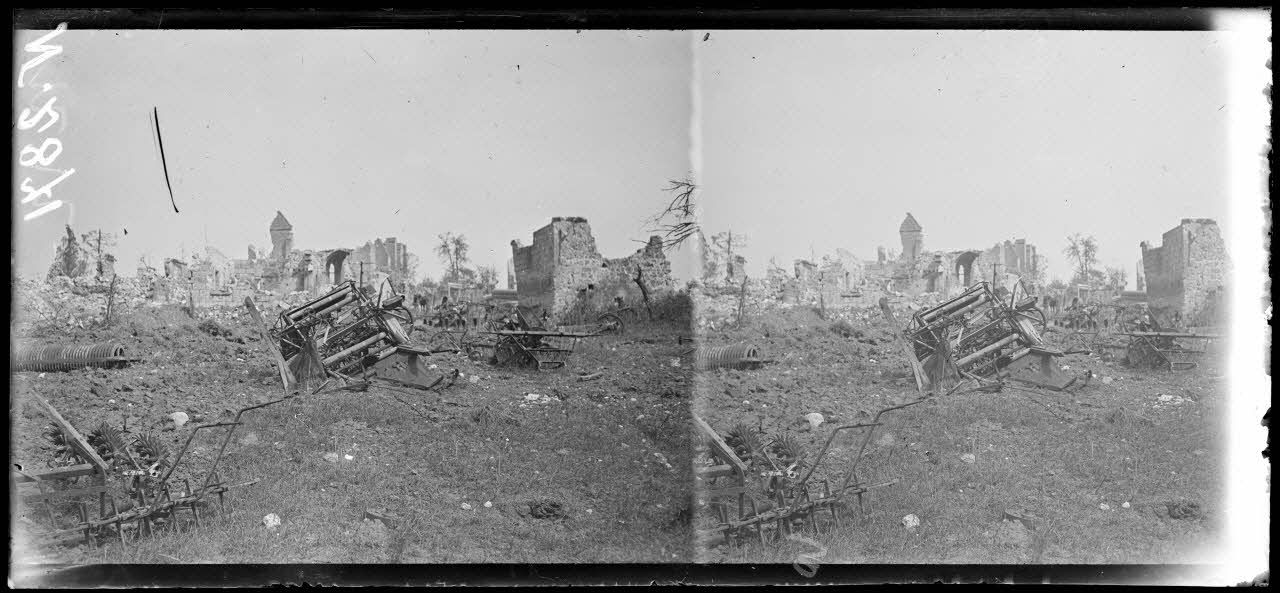 Dans l’Aisne, à Morsain, un poste de secours accueille les blessés qui sont évacués sur brancards en camion sanitaire, et à l’arrière d’un camion de transport pour ceux qui peuvent marcher ; les machines agricoles sont rendues inutilisables, l’église et le village sont détruits, seul le château tient encore debout ; un convoi de prisonniers allemands circule, officiers en tête. Dans Chevillecourt, quasiment rasé, un convoi hippomobile traverse les ruines en soulevant de la poussière. A Trosly-Loire, l’église est jonchée de gravats, la toiture crevée et les vitraux soufflés. L’église de Guny n’a plus de toit. A Coucy, le château a été bombardé et ses abords ne sont plus qu’un amoncellement de pierres et de moellons ; les Allemands ont construit une barricade à l’entrée du village avec les pierres d’une tour médiévale. Un convoi d’artillerie traverse les ruines de Juvigny. A Soissons, une barricade édifiée par l’ennemi barre encore le pont des Anglais du côté du faubourg Saint-Waast ; la toiture de la cathédrale s’est écroulée dans la nef, tandis que la façade de Saint-Jean-des-Vignes demeure intacte.