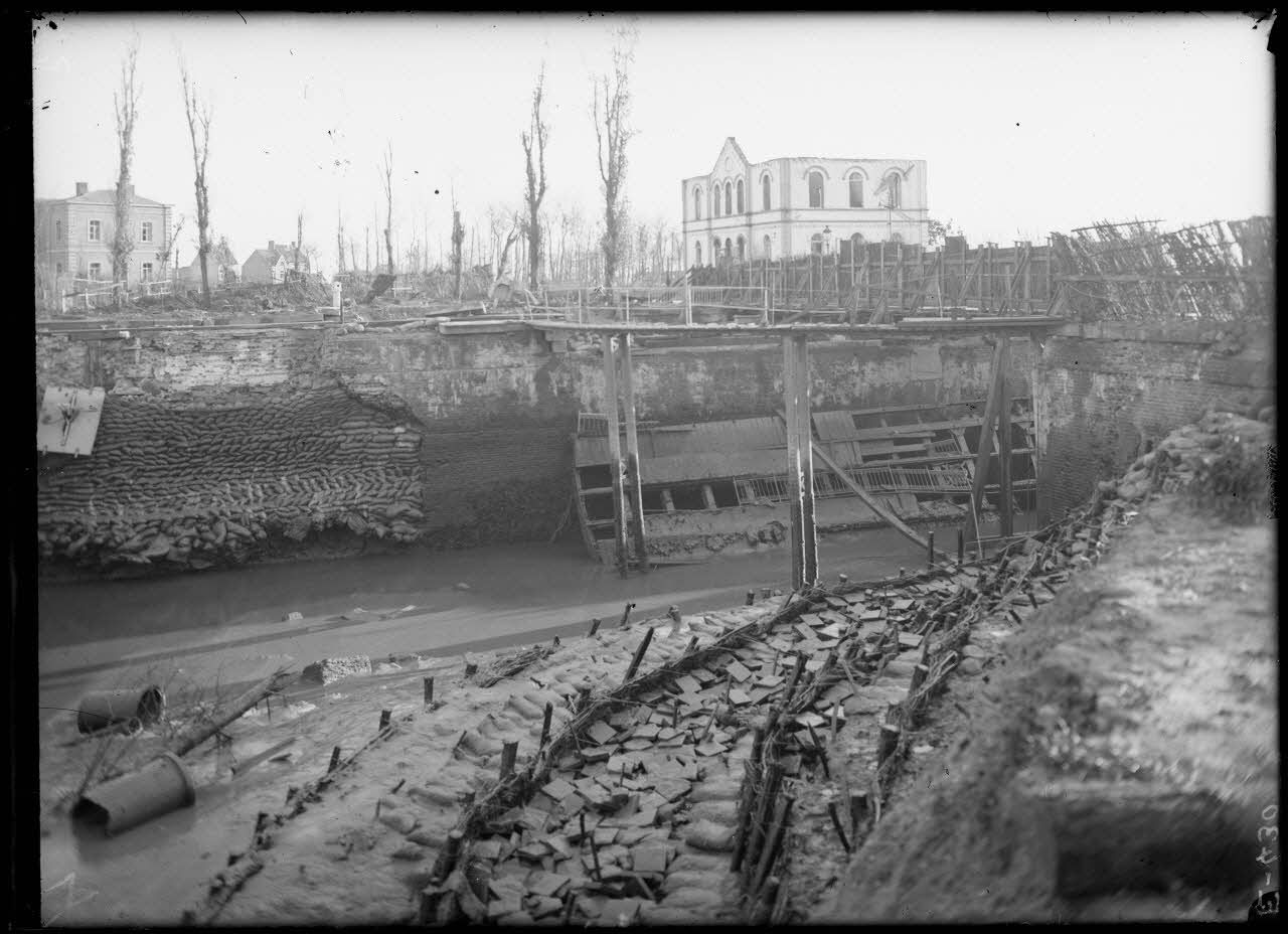 - des vues panoramiques de l'Yser (plaques de verre SPA E 425 à SPA E 431) et notamment de la patte d’oie à l’est de Nieuport, un complexe de canaux d’écluses ayant servi à l’inondation du secteur en 1914 pour stopper l’avancée allemande ;