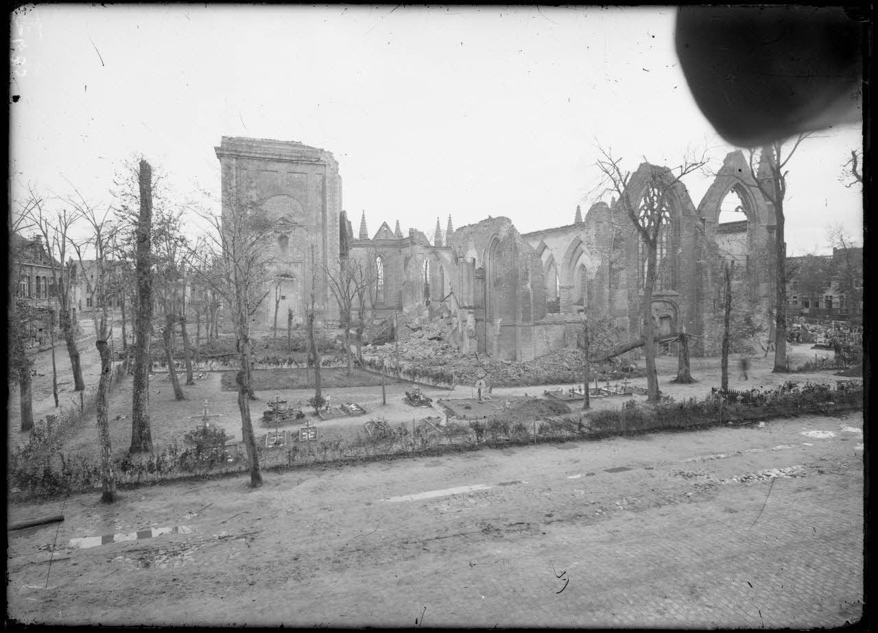 - la ville de Nieuport : la tour des templiers (plaque de verre SPA E 432), l'église ruinée par les bombardements et le cimetière où reposent des soldats belges sous des tombes décorées avec des matériaux de fortune (plaque de verre SPA E 433 - SPA E 436) ;