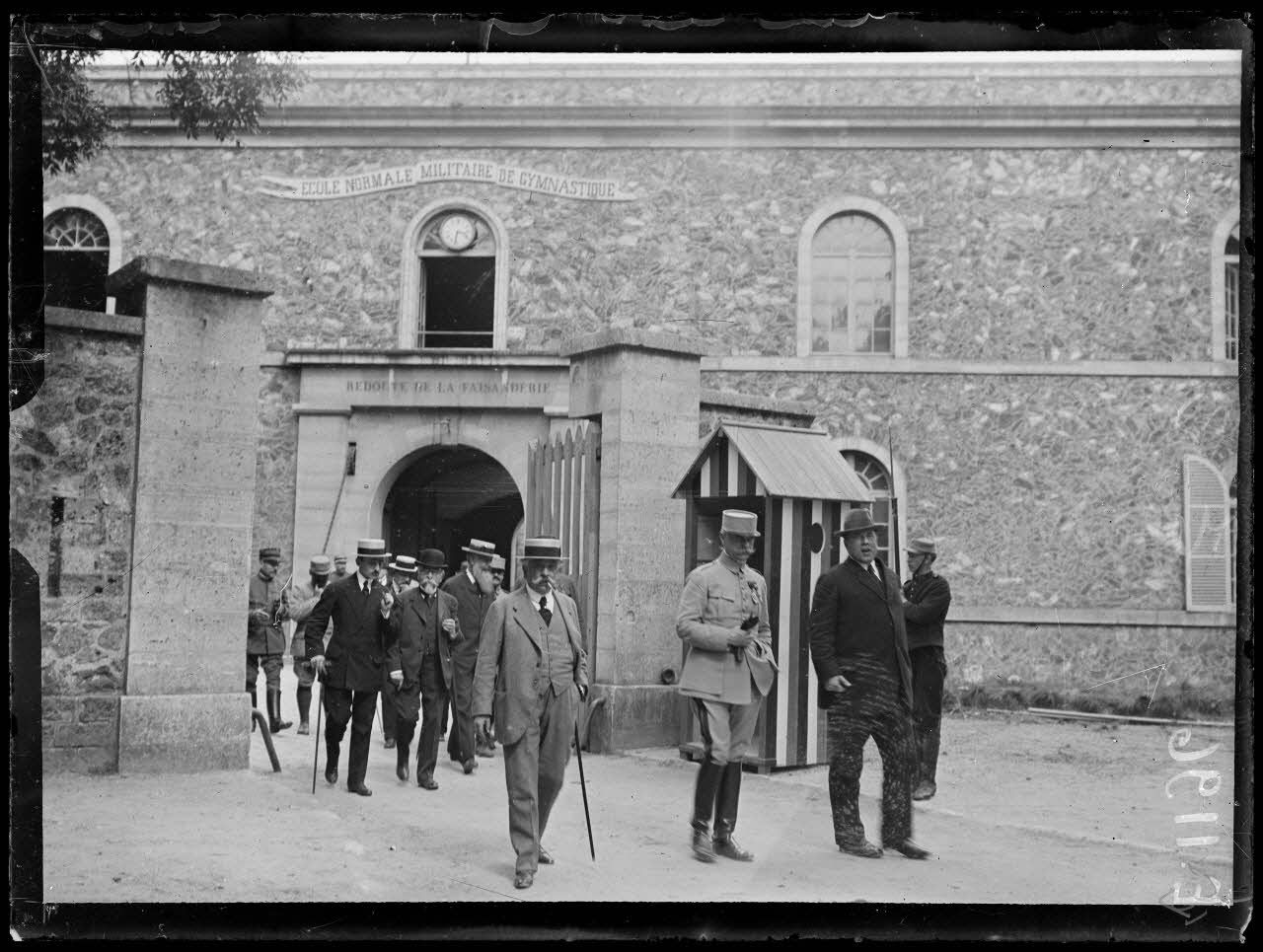 Joinville-le-Pont (Seine). Ecole normale militaire de gymnastique. Le général Margot, directeur de l'Infanterie au ministère de la guerre, sort de l'école avec une délégation de députés et sénateurs qu'il mène sur le terrain. [légende d'origine]