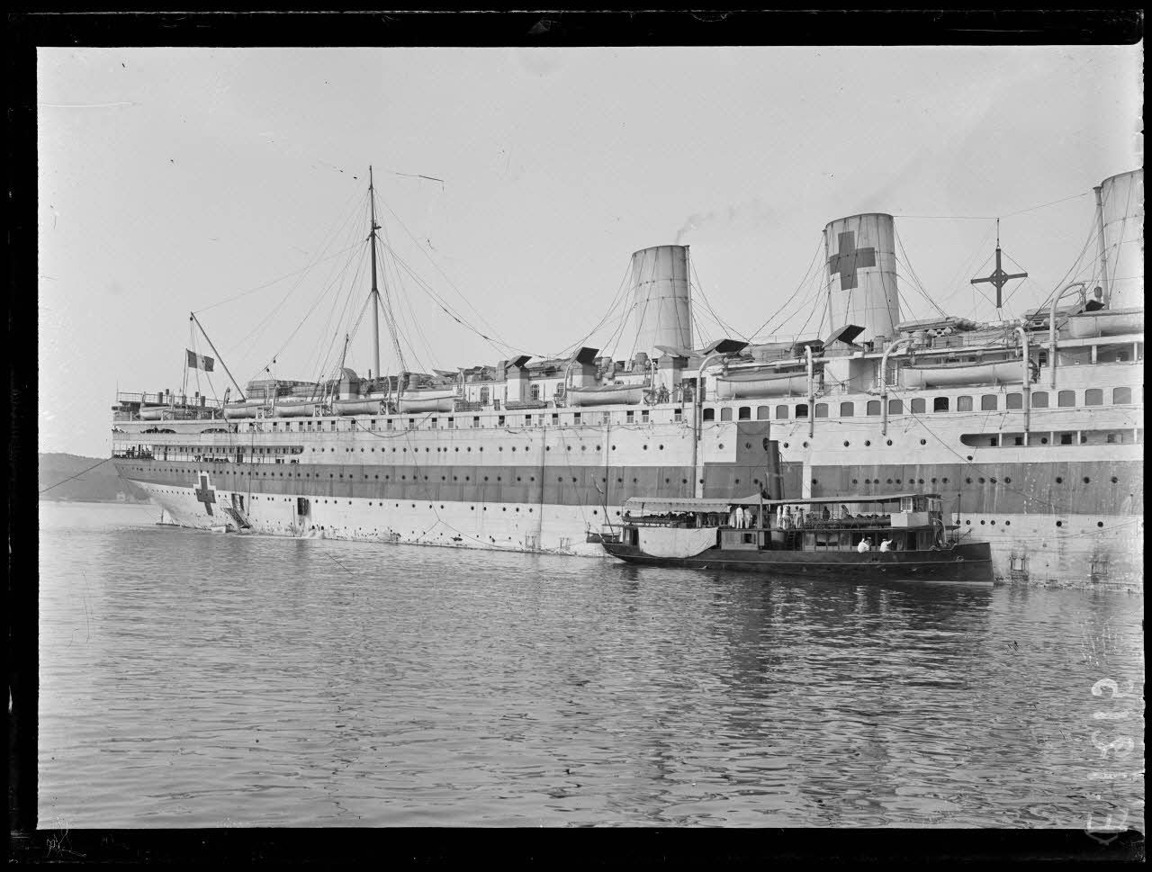 Toulon. Navire hôpital La France. L'hirondelle chargée de troupes part pour l'hôpital Saint-Mandrier.