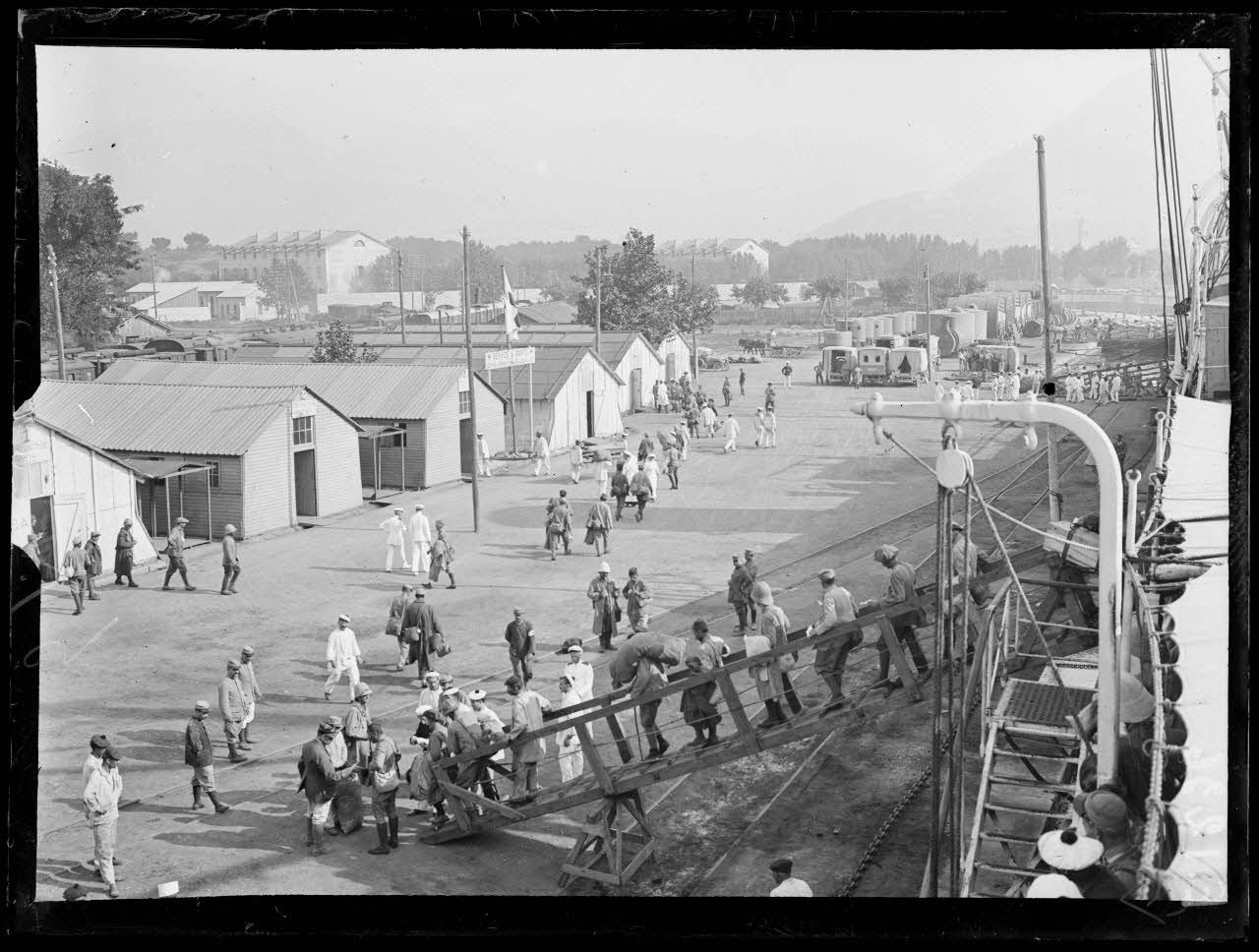 Toulon. 4 août 1916. Descente des malades du navire hôpital Le Tchad. [légende d'origine]