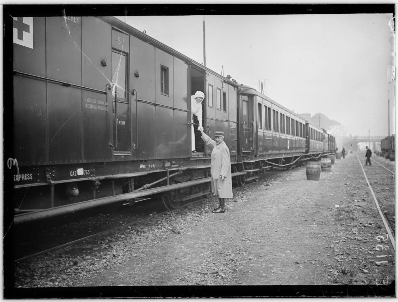 Le lieutenant-colonel d'administration Carré et sa femme, l'infirmière major Marguerite Carré, posent devant un train sanitaire en gare de Pantin.